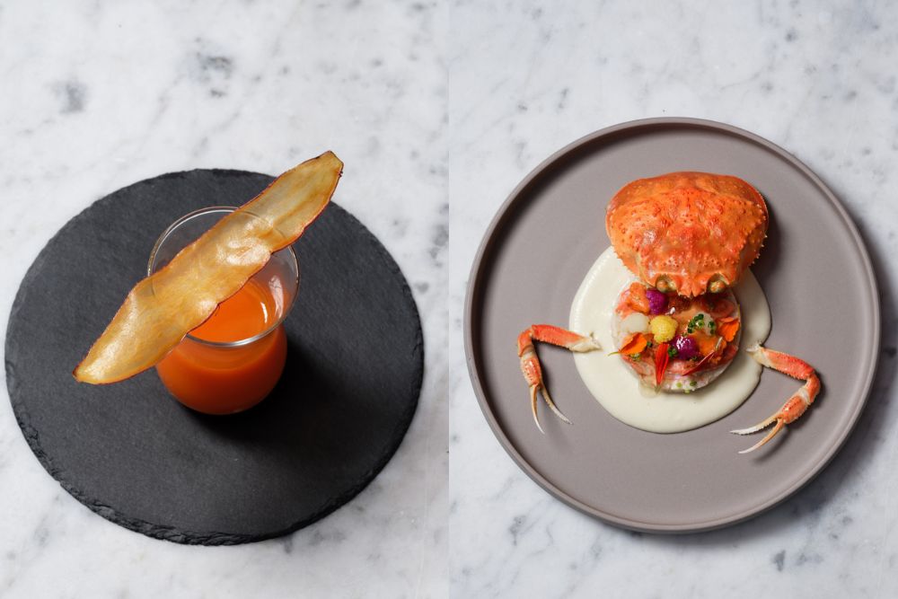(左)「金沢野菜のコールドプレスジュース 五郎島金時のチップ」がコース料理のスタート。(右)「金沢港産香箱ガニ カリフラワーのピューレ カラフルカリフラワー 大野醬油を使った蟹酢ジュレ」。濃厚な内子とプチプチ食感の外子、ほぐし身を美しく合わせ、加賀料理に欠かせない大野醤油を使った蟹酢のジュレとご一緒に。