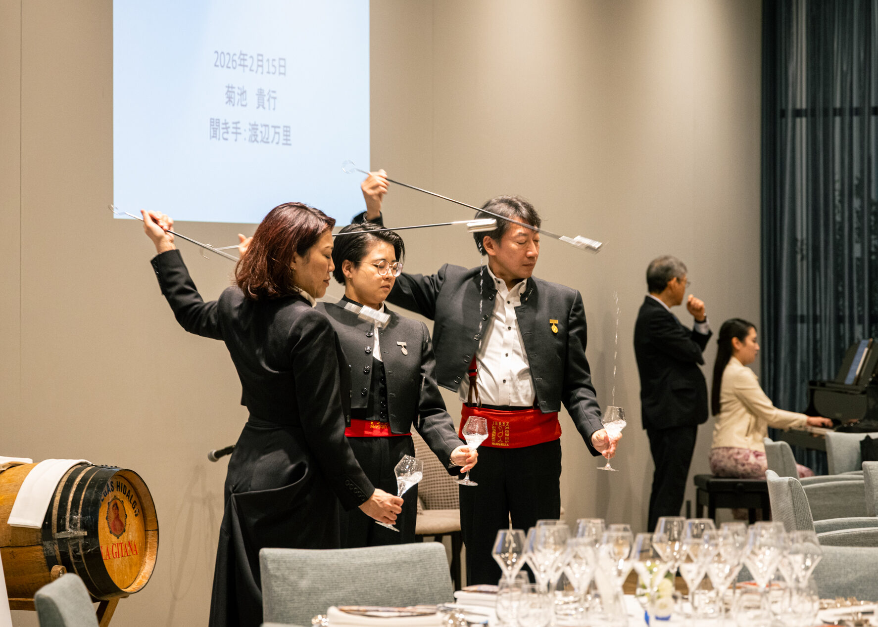 (TOP写真)スペイン南部アンダルシア地方のサンルーカル・デ・バラメーダで造られる辛口シェリー「マンサニージャ」を、ベネンシア・スタイルで高い位置から注ぎ、空気を含ませて香りを立たせる。潮風を思わせる塩気を帯びた独特の味わいで、現地ではエビや貝、白身魚などの魚介料理と合わせることが多い。