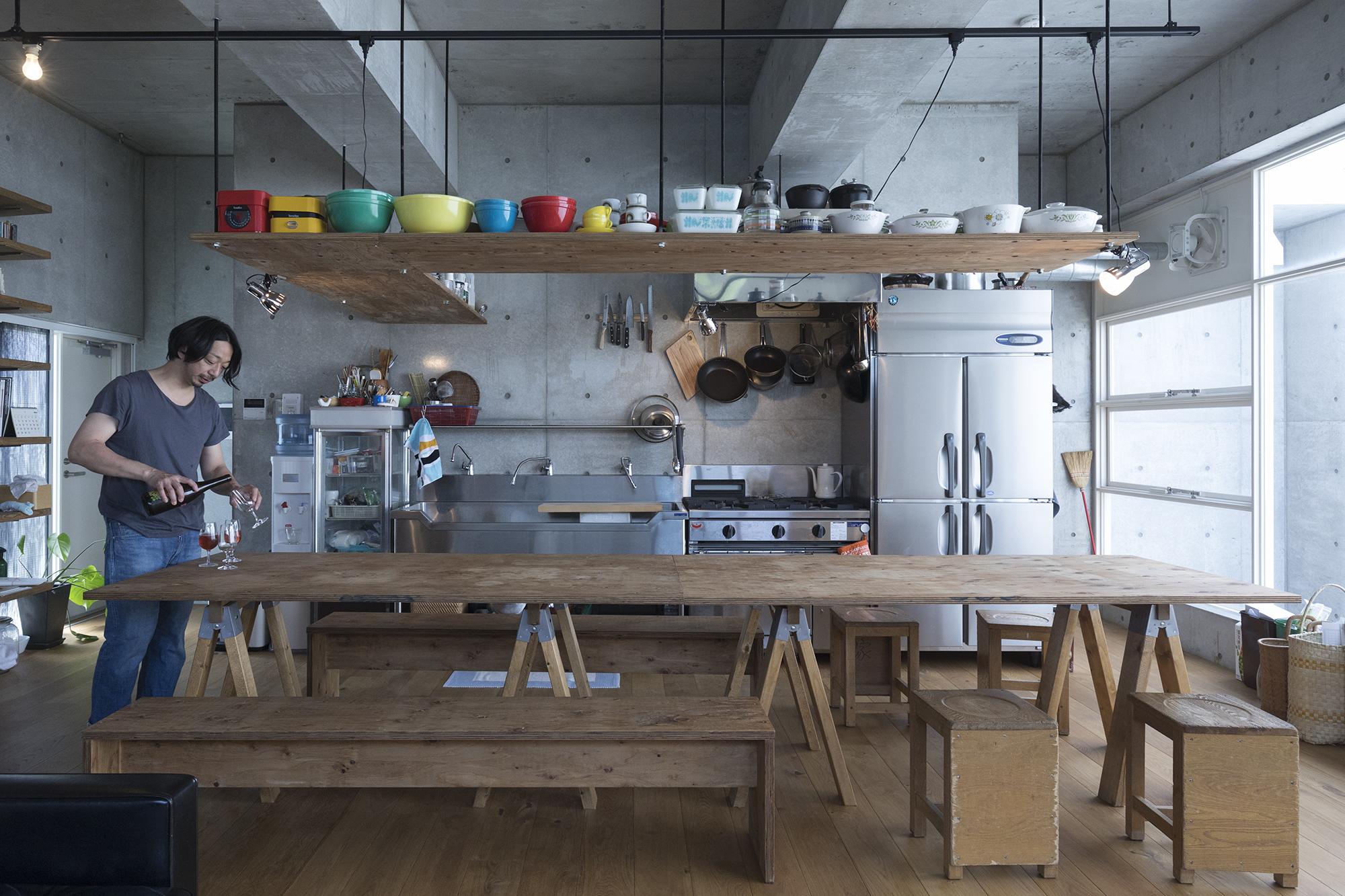 「店じゃん!」。齊藤家の新居2階に踏み込むや、友人たちは異口同音にそう叫ぶそうだ。ぽーんと天井の高い30畳大の大空間。コンクリート打ちっぱなしの壁に沿って整列する、ステンレスの業務用シンクやガステーブル。確かに「台所」より「厨房」の呼び方が似合う設えではある。「住宅ぽくしたくなかったんですよね。たとえば流行りのアイランド作業台みたいな、高価で“ いかにも”な感じは、いらない」
