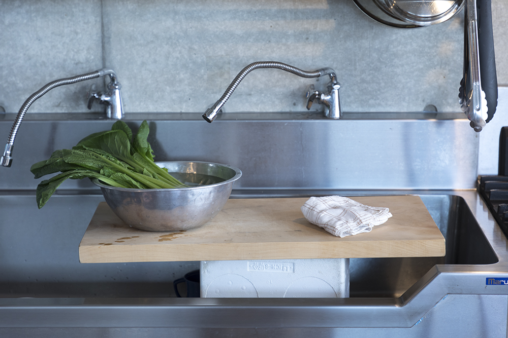 魚屋でも使われる舟形シンクは使い勝手も上々。台の上にまな板を置いて、作業台にも使う。