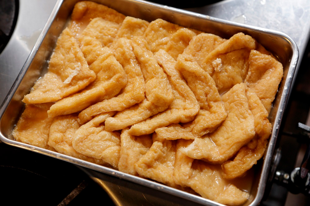 油揚げは東京・池袋の「大桃豆腐」のもので、通常のいなり揚げよりも小さい特注サイズ。市販の長方形の油揚げを使う場合は、長辺を半分に切って俵型に包むと作りやすい。