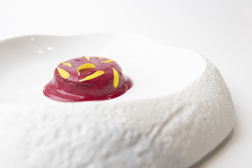 エドゥアルド・チリーダ(バスク人彫刻家)のデッサンを彷彿とさせる一品。トウモロコシに小エビのフォンとアチョーテ(赤色の食用色素としても知られるベニノキ科の植物)を混ぜてベースに。トウモロコシを焼いた際の灰を使って黒い絵を描き出す。海岸線で栽培される原種のトウモロコシは存続の危機にあるものが多いそうだ。