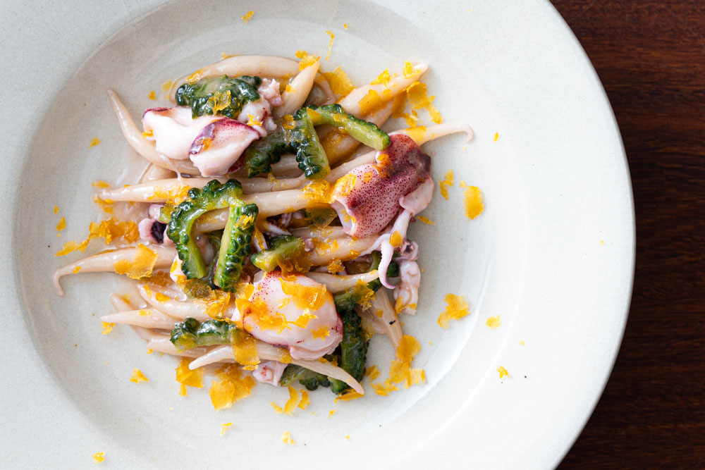 合わせる具材は、旬の魚介と野菜だ。「『ゆめかおり』のトロフィエに甘味があるので、しっかりした味の旬のヒイカとエッジの立ったゴーヤの苦味で引き締めつつ、際立たせるイメージ」。仕上げにかけた自家製カラスミとヒイカの深い旨味に甘やかなトロフィエが絡み、ゴーヤのほろ苦さがアクセントをつける。