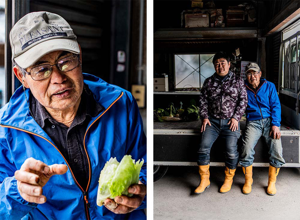 芽キャベツからセロリまで、畑から小型ナイフで野菜を収穫しては、来訪者に味見させる茂夫さん。「うちの野菜はえぐみがないでしょ。あるのは甘味で、それも口の中であと残りせずきれいに消える。これが料理人にとって大事なの」