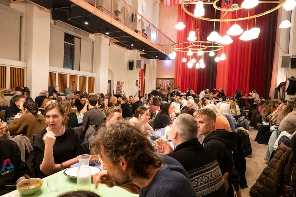 代表的なのは民間の文化施設「アブサロン(Absalon)」で開催されるフェッレスピースニンだ。会場に到着すると、スタッフが座席表にペンで印をつけて「ここに座って」と指示をする。テーブルには知らない人ばかり。セルフサービスとなっていて、テーブル内で誰が料理を取りに行くか、片付けるかなどを決めるために、必然的に他者と会話をしなければいけない。場を盛り上げる司会者もおり、現場にはまるで合宿所のような活気が溢れていた。