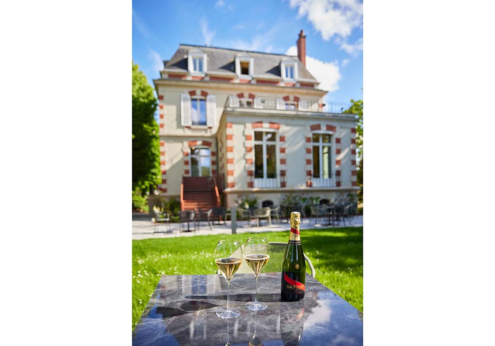 (写真トップ)美しい邸宅には、マム社の歴史を物語る古い写真やオブジェがたくさん飾られている。気候がよい時はテラスでアペリティフも。ワインペアリングコースも提案。