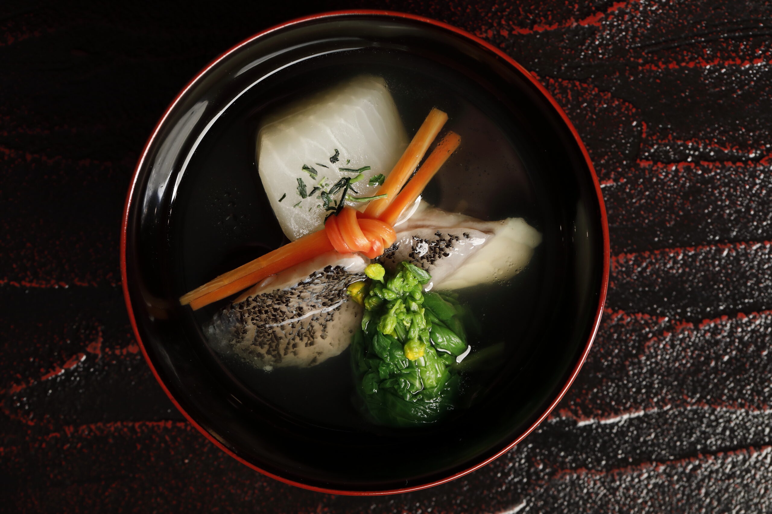 茶葉と鰹節、それぞれに適した温度で引き出しただしを張った椀。「海温上昇で昆布の価格が上がる中、茶葉への期待は大きい」と、浜松「懐石いっ木」一木敏哉さん。