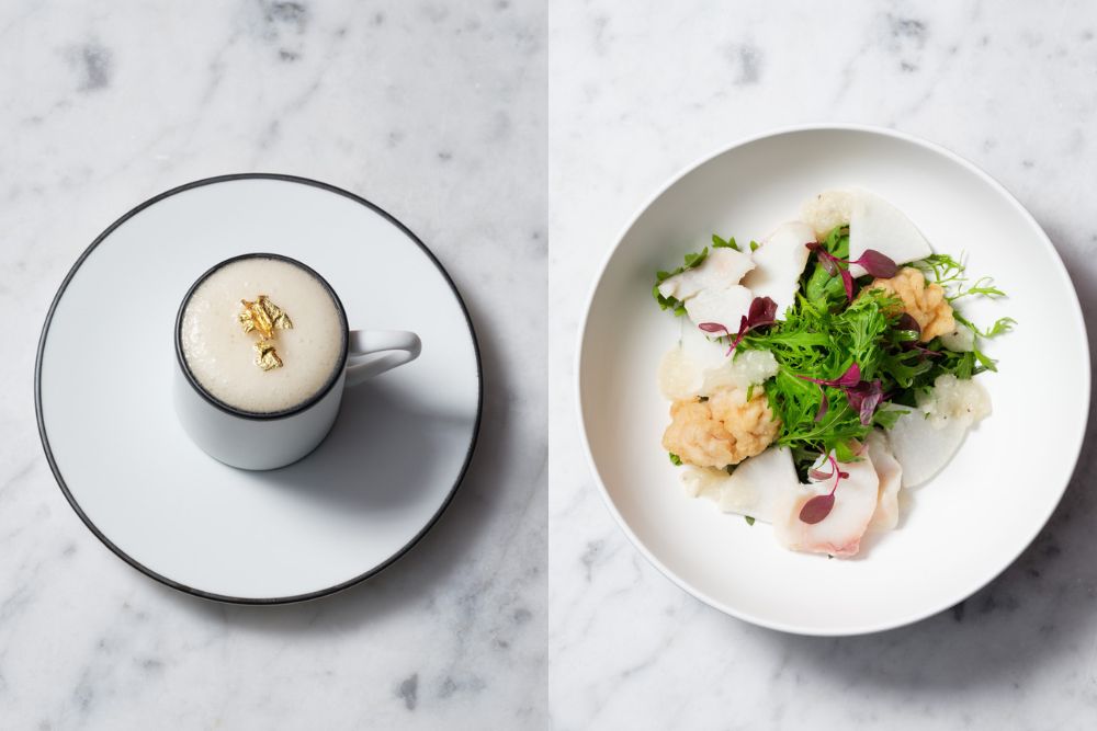 (左)香箱ガニの旨みを抽出したスープに、ふんわり泡立てたクリームを重ねた「香箱ガニのコンソメスープ カプチーノ仕立て 金沢金箔添え」。(右)「金沢港産鱈のフィレと白子のフリット 金沢春菊 二塚からしな OTMアマランサス 源助だいこんドレッシング」。石川県産米粉をまぶした白子のフリットが主役の一皿。金沢のファームブランド「OTM」のマイクログリーンや香味野菜がまろやかな白子を際立たせる。