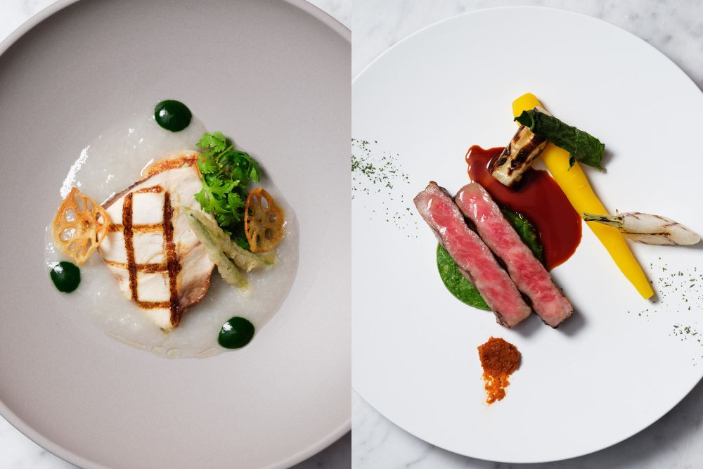 (左)「金沢産塩糀でマリネした金沢港産鰤のグリル 金沢せり 加賀れんこんのガレットとすり流し」。金沢せりの爽やかなソースがアクセント。(右)「国産牛サーロインのグリル 加賀米野菜基地のバーニャカウダ 人参 金沢産蕪のグリル 金沢一本太ねぎのロースト 金沢一本太ねぎベーゼ 金沢柚子胡椒ソース」。コースのラストには、「金沢藤五郎のシフォンケーキ 金澤やまぎし養蜂場のさくら蜂蜜アイスクリーム きよし農園の柚子ソース」を。