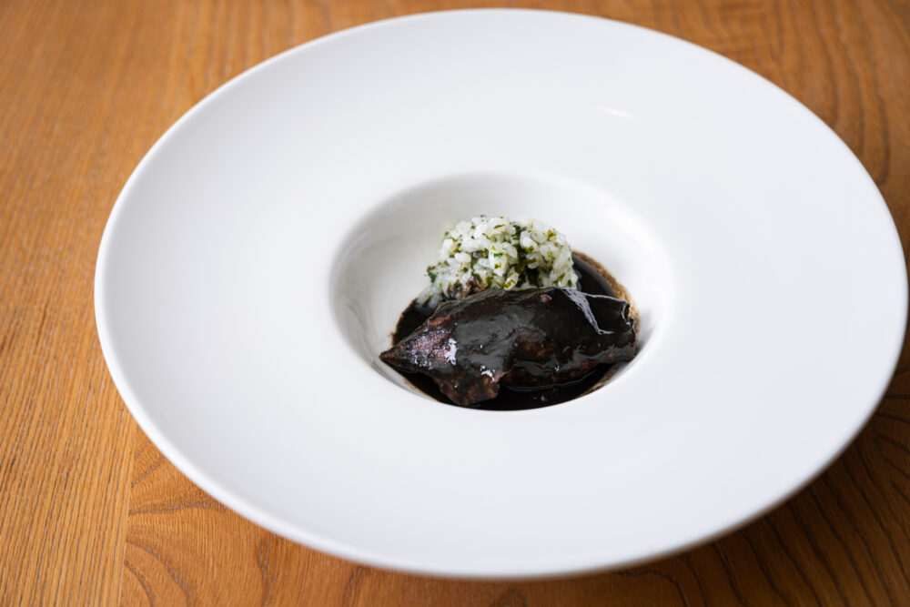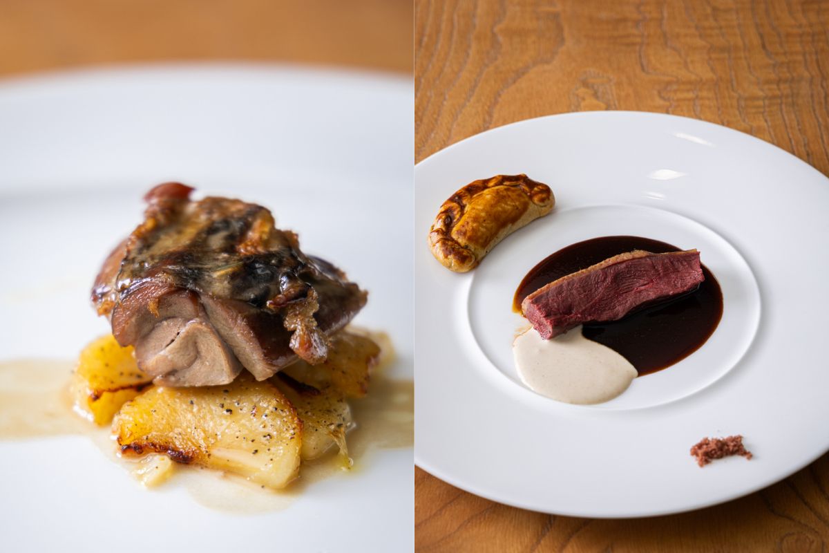 常陸大宮「ヨシキ・フジ」藤良樹シェフは、GI認定の天然のマガモを炭火で焼き、塩を加えずに仕上げた鴨のだしと赤ワインのソース、水戸納豆と豆乳のソースを添えて供した。