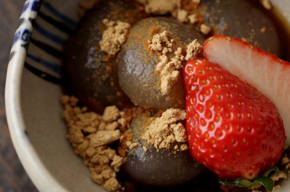 臭みの少ない自家製こんにゃくならではの一品。白玉の代わりにころんと丸く茹でたこんにゃくに黒蜜ときな粉をトッピング。体にうれしい、ヘルシーな甘味に。