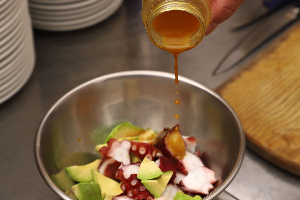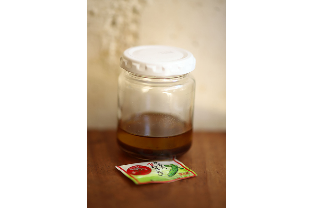 【4】和える直前に、小瓶に用意しておいたドレッシングにワサビを加える。