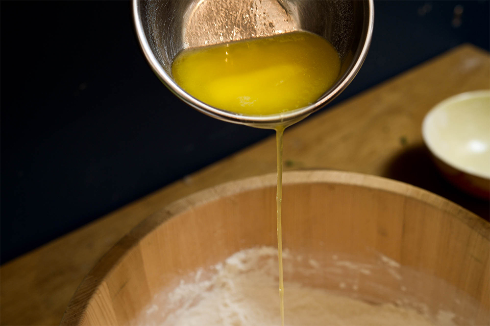 強力粉と塩をボウルに混ぜ合わせ、溶かしたバターを加えて粉全体になじませる。