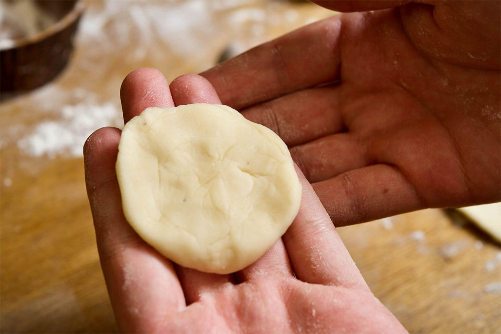 麺棒で、直径12cmほどの円形に伸ばす。麺棒は手前に動かし、生地のほうを回転させていくとよい。