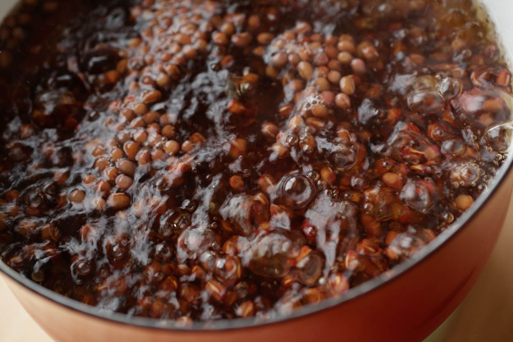 崩れていない硬そうな小豆を指で潰してみて、中のデンプン質が簡単に崩れて芋のような質感になったらOK。すべての豆がやわらかくなるまでしっかりと煮る。