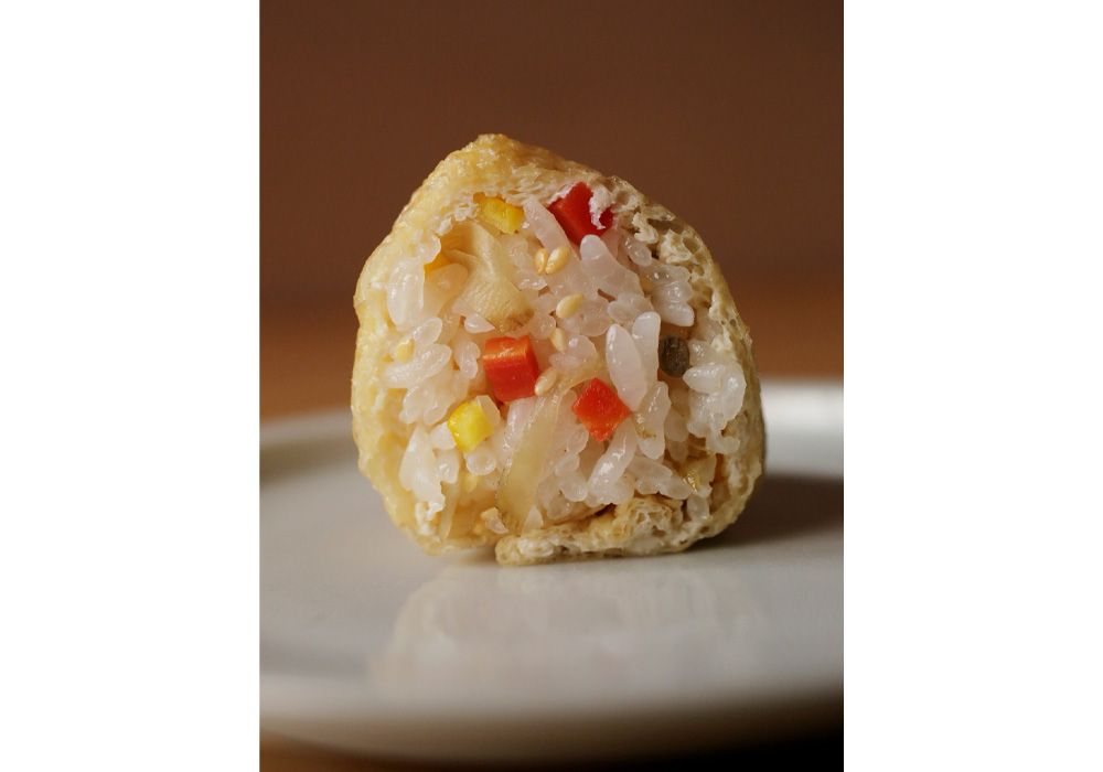 稲荷ずしに重要なのは、味のバランス。揚げと酢飯と具と、どれも単体だと「物足りないな」と思う味に仕立てる。全てを一緒に口に入れて初めて味が完成するんですね。揚げが甘いから、酢飯は甘さを抑える。具も、例えばトウモロコシのように、甘さがその素材の魅力になっているものは合いません。ショウガなどを酢漬けにして混ぜる時は、甘酢ではなく塩と酢だけで漬けます。それから、香りのあるものをアクセントに選ぶこと。ユズやスダチなどの柑橘類は使いやすいですね。和にこだわらず、クミンや花椒、パルミジャーノチーズなどの香りものを使ってみてもおいしいです。