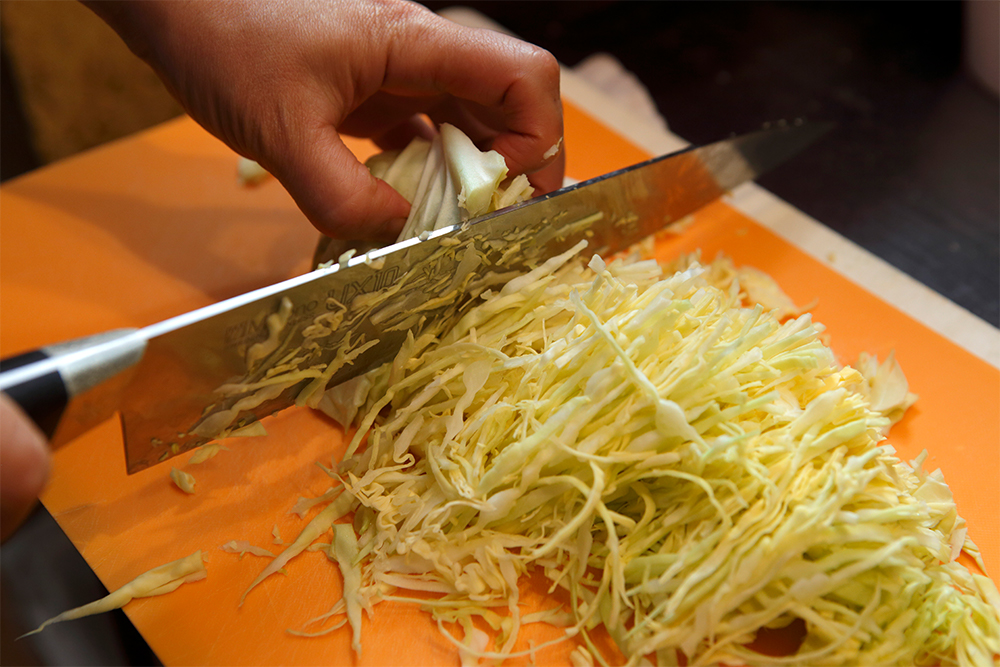 キャベツをせん切りにする。