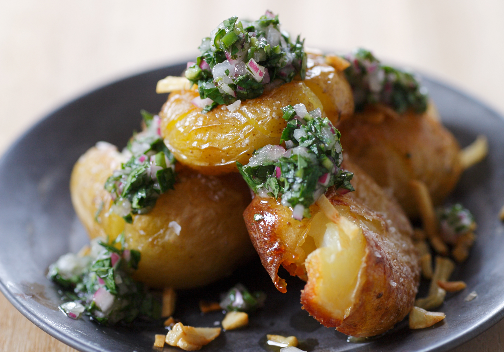 私はこれが大好きで、少しアレンジして、このジャガイモだけで1皿のつまみにして楽しんだりしています。たとえば上に、ポルトガル伝統の万能ソース「モーリョ・ヴェルデ(緑のソース)」をかけて。青唐辛子やイタリアンパセリ、香菜をペーストにして、白ワインビネガーでまとめた酸っぱい味わいが、ニンニクオイルのパンチが効いたジャガイモを、さっぱりまとめてくれます。シンプルに塩を粗く振っただけでも、香ばしいニンニクチップと相まって、実に後を引くおいしさです。