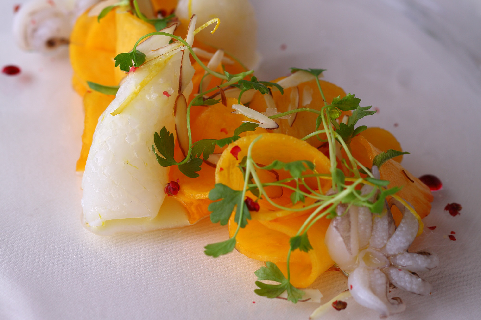 下処理されて程良く身が締まり、ぷりぷりした食感のイカに、レモンバーベナの香りでマリネしたみずみずしい桃を合わせて。アーモンドとピンクペッパーをトッピングし、辛味と香ばしさ、食感をプラス。