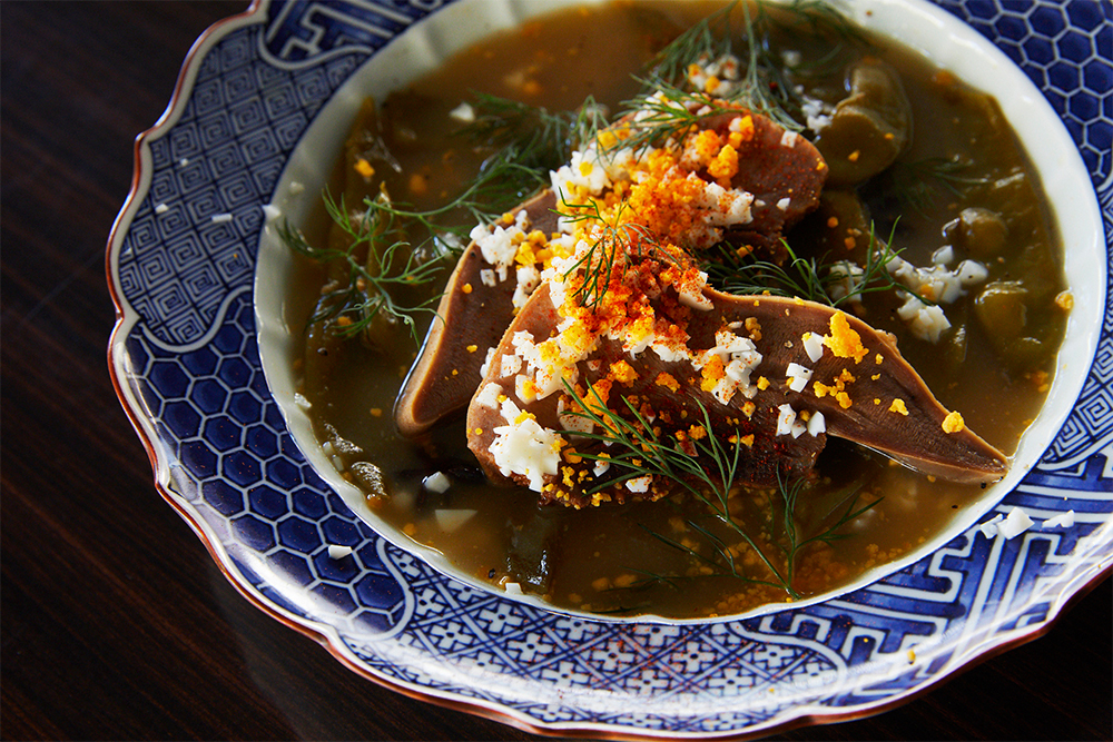 菅原 定番メニューには煮込みはないからね。以前作ったのは、鶏のスープと塩漬けの発酵白菜のだしに、イノシシ肉を加えて煮込んだものでした。イノシシは煮込めば煮込むほど旨いから2、3時間煮込みます。今日は似たもので、鹿の煮込みを作りました。鶏の2番だしで鹿肉を煮込んで、そこに軽く炙ったスルメをどぼんと加える。