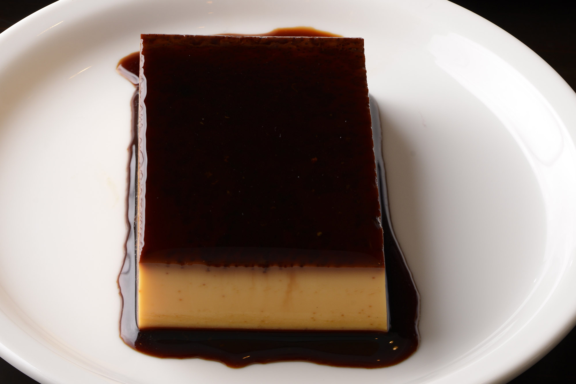 バター不足の時に、バターを使わないデザートを考えて思いついたプリンです。プリンって、みんなが懐かしさを感じる料理で、人によっていろんなストーリーがある。そんな子ども時代の思い出を、自分の料理として昇華させるならどうするか。イメージしたのは、当時主流のトロトロ系ではなく、しっかり硬いやつ。しかも、お酒に合わせても楽しんでもらえる、“大人仕様”のプリンです。
