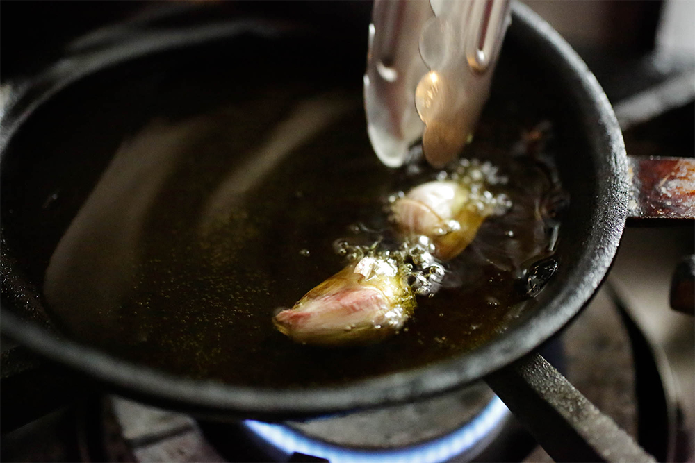 皮付きのままでゆっくりニンニクを加熱すると、みじん切りやスライスにしたニンニクとは違った奥ゆかしい香りが引き出される。ニンニクは皮の中で蒸し焼き状態になり、最後はホクホクとしたイモのような食感に。残ったオイルのほうも他の料理に展開する。