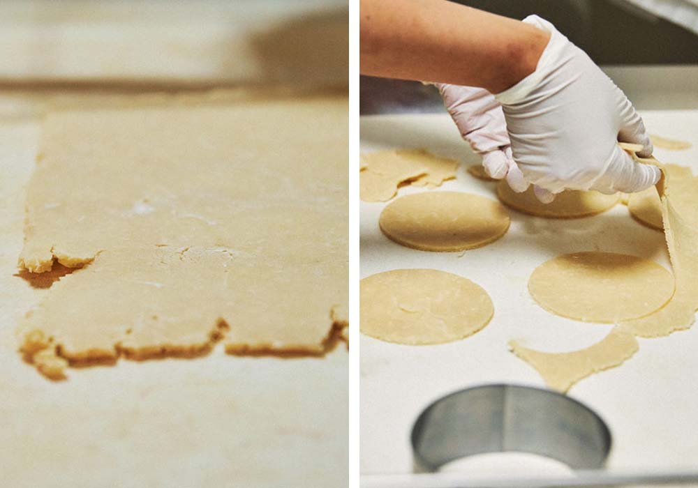 20℃のパイルームで一晩置き、生地が軽くゆるんだら、リバースシーターで2.7mm厚に伸ばし、直径10cmのセルクルで抜く。